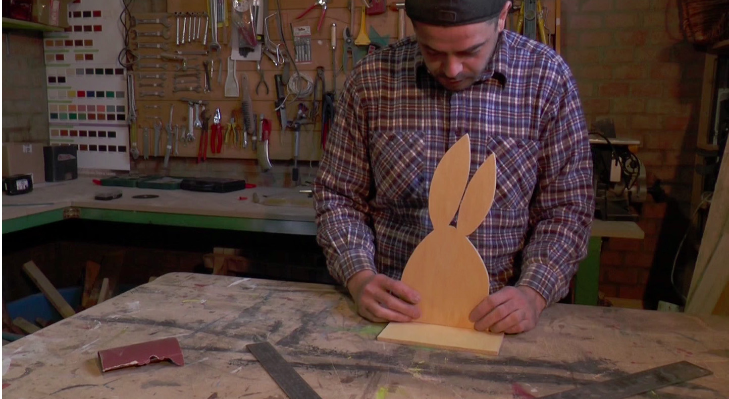 - Prendiamo la tavola di legno e disegnamo la sagoma del nostro coniglietto a matita; possiamo farlo a mano libera o stampare la sagoma del coniglietto e riportarla sul legno.
