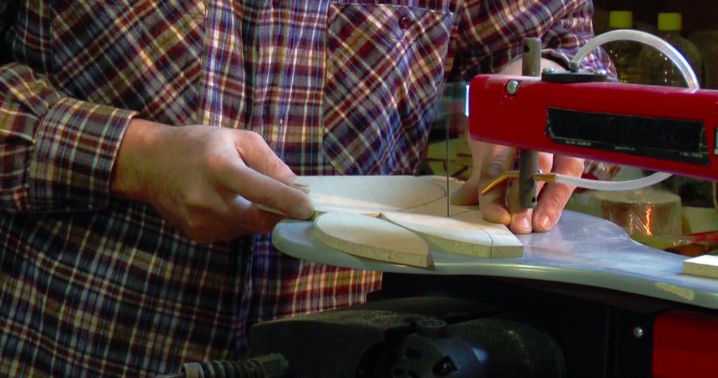 - Prendiamo il traforo e tagliamo la sagoma di legno con attenzione; regoliamo la tensione della lama quando necessario.