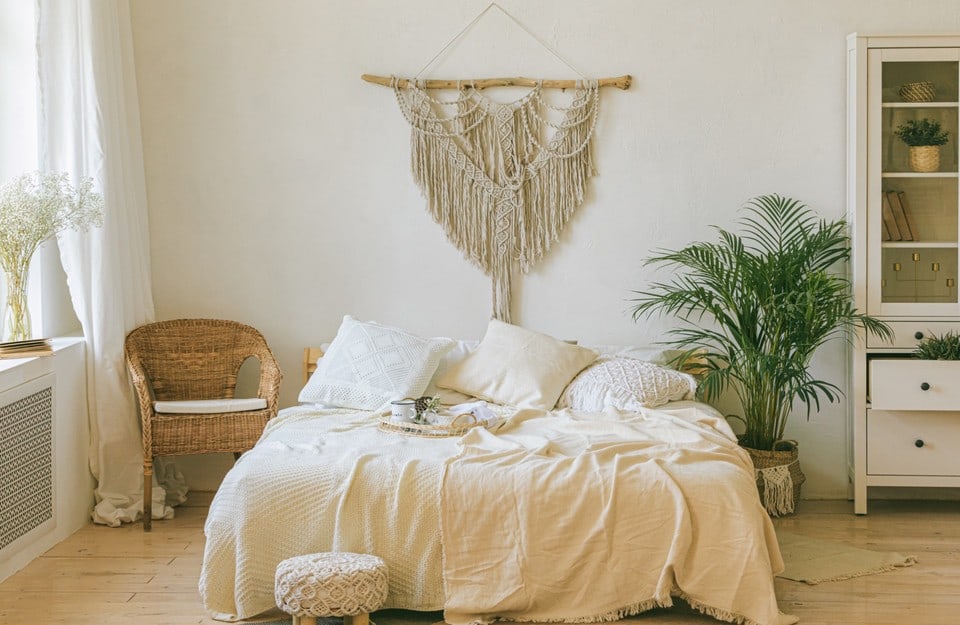 - Letto basso con testiera in lino o legno: favorisce il senso di radicamento e relax. Essenziale, ma carico di atmosfera.