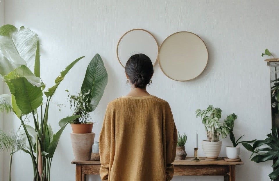 - Specchio con cornice in legno naturale o decapato: amplifica la luce e introduce un elemento di profondità e contemplazione.