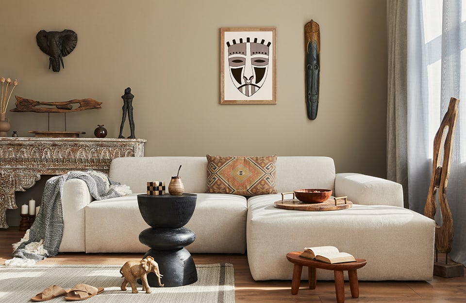 In una living room dominata da elementi etnici spicca un sofà moderno che si abbina perfettamente al resto.