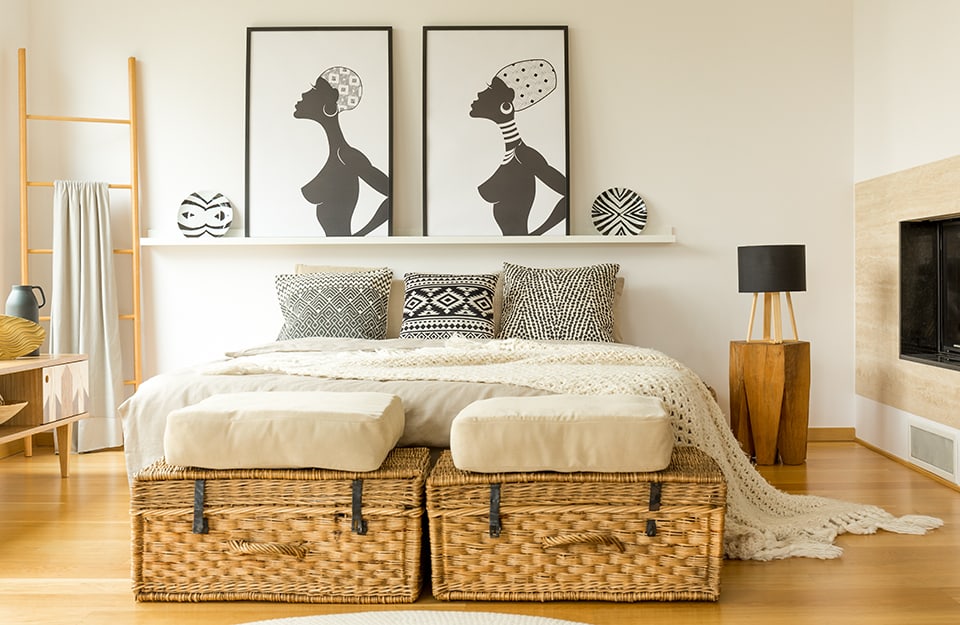 In questo caso si tratta delle stampe, dei cuscini, dei piatti e dei cesti di vimini posizionati in fondo al letto.