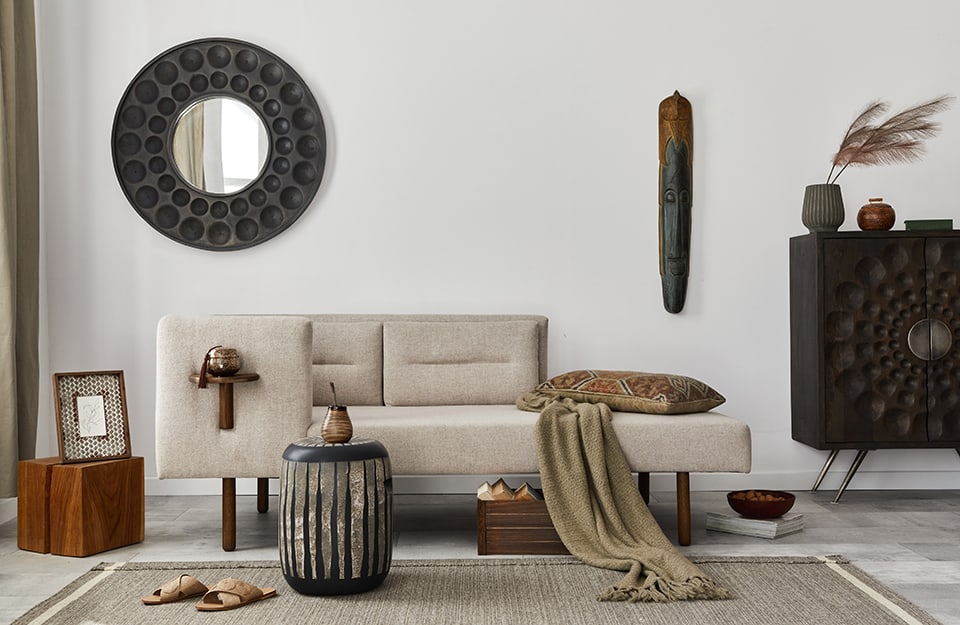Una chaise longue minimalista che starebbe benissimo in un salotto dal sapore nordico diventa immediatamente etnica grazie a tutto ciò che la circonda. In questo caso una maschera africana, un cuscino con stampe geometriche, un tavolinetto che sembra uno strumento a percussione, un grande specchio con decorazioni tribali e poi vasi e vasetti che vanno dall’Oriente al Sud America, passando per l’Africa.