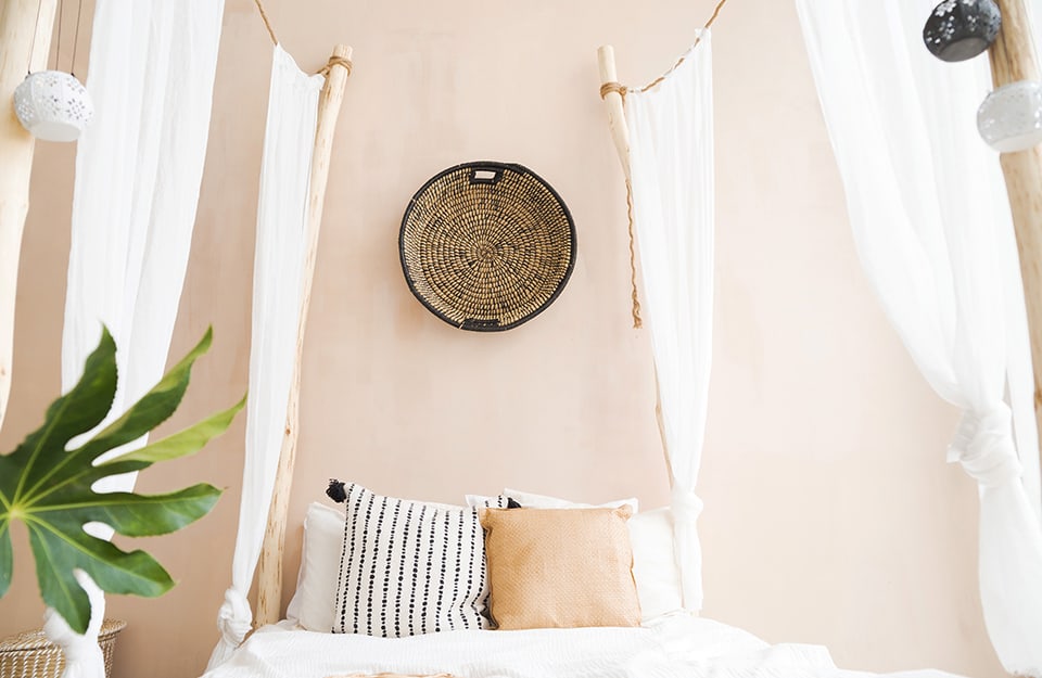 Un altro esempio di stanza da letto, ancora più semplice. In questo caso si usano baldacchini con tende o zanzariere e un grande cesto decorativo appeso sopra la testiera. Il tutto arricchito da cuscini monocromatici e con pattern etnici, dei portacandela appesi e una pianta.