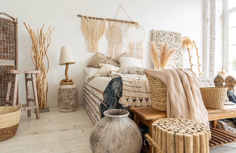 Per quanto riguarda i materiali: giunco, rattan, bambù, vimini, pelle, lino, cotone, lana, ceramica e, ovviamente il legno. In pratica tutto ciò che è naturale.
