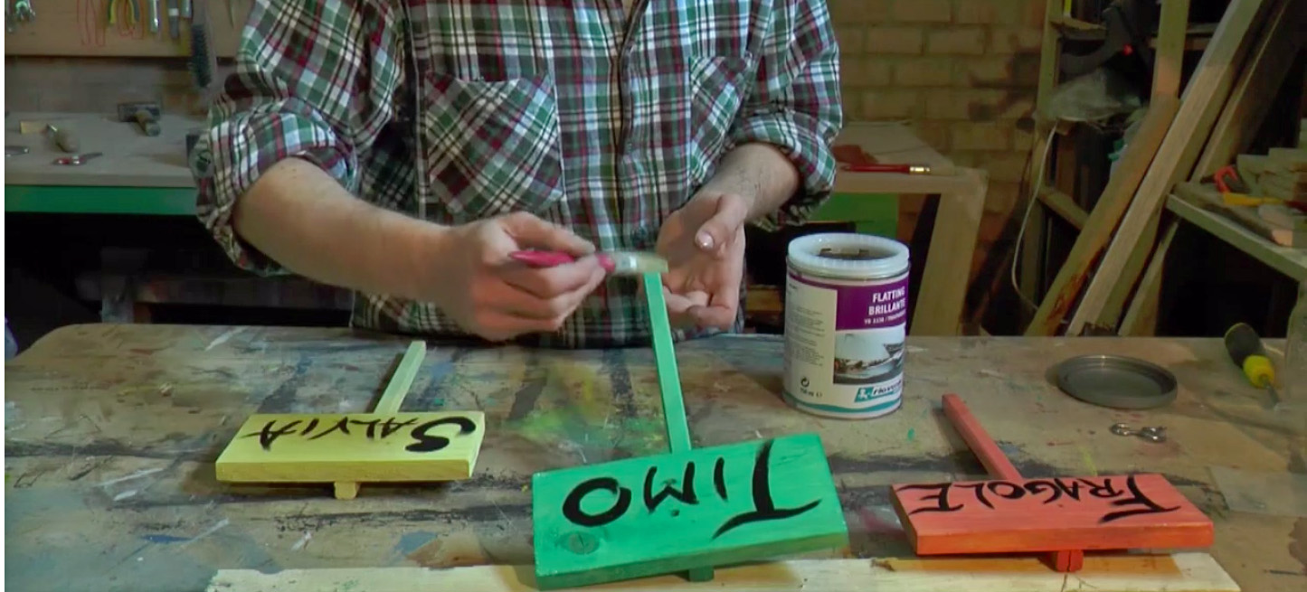 Possiamo scegliere le tinte all’acqua per legno che più ci piacciono e garantire la durata delle targhette con il flatting brillante, un prodotto altamente impermeabilizzante e resistente, solitamente usato per la verniciatura delle barche e studiato per resistere a climi marini e intemperie.