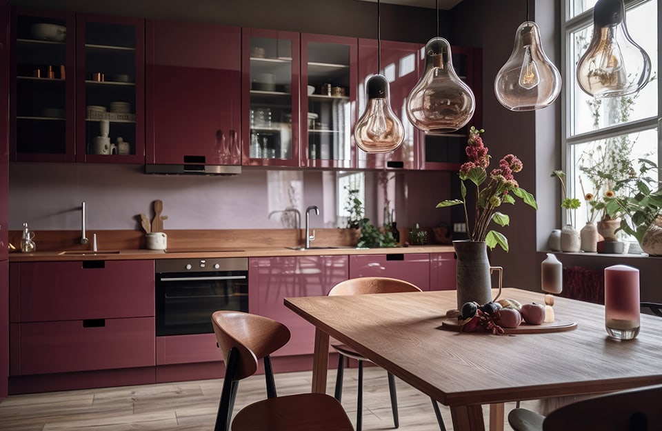 - sugli arredi: i mobili bordeaux possono aggiungere un tocco di colore e personalità alla cucina. Questa tinta si può impiegare sugli arredi principali, come i pensili e i mobili da lavoro, oppure per sedie, tavoli, sgabelli o gli elettrodomestici (ad esempio un bel frigorifero dallo stile vintage, che potrebbe diventare il focus dell’intera stanza);