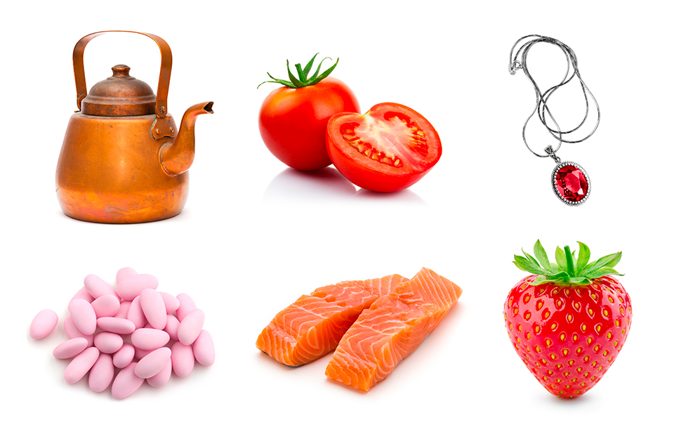 Composizione di alcuni degli elementi che rappresentano i colori con la R: una teiera di rame, dei pomodori, un rubino, dei confetti, dei tranci di salmone, una fragola