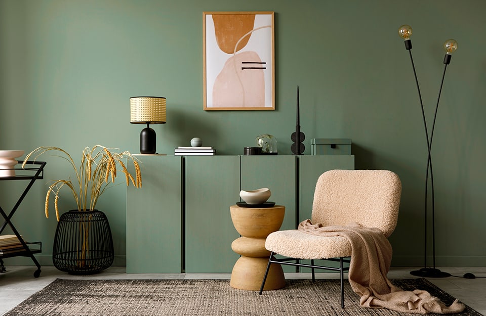 • toni metallici, specialmente rame e ottone, su lampade, elettrodomestici e sedute, per un mood elegante. Nella linea di vernici metallizzate Golden Prestige di Rio Verde consigliamo, in abbinamento col verde salvia, l’Oro giallo, l’Oro Bruno, l’Oro rosa e l’Oro nero.