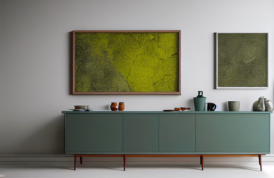 Una consolle verde salvia scuro con sopra degli oggetti in una stanza con pareti grigio chiaro con due quadri astratti sul verde, appesi al muro