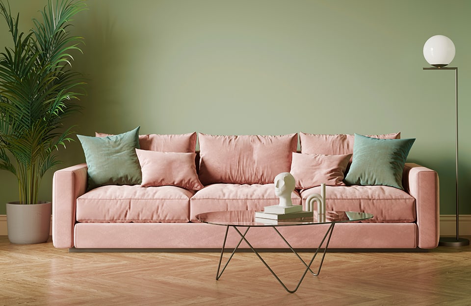 Un salotto con pareti verdi salvia, un sofà a tre posti rosa pastello con cuscini rosa e verdi, una lampada da terra, un tavolino minimalista in metallo e una pianta in vaso, su un parquet