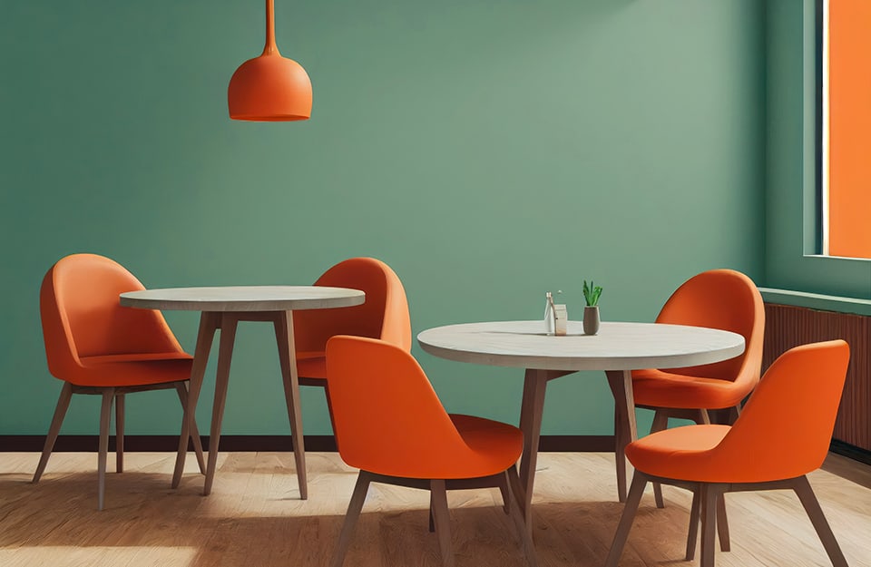 Una sala da pranzo con pareti verde salvia, tavolini in legno con pianale grigio, sedute arancioni e lampadario arancione
