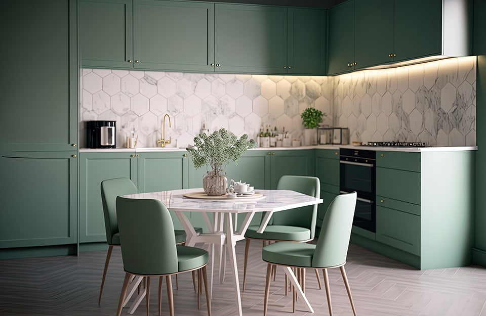 Una cucina con mobili color verde salvia, piastrelle esagonali bianche marmorizzate, tavolo bianco e sedute color verde salvia