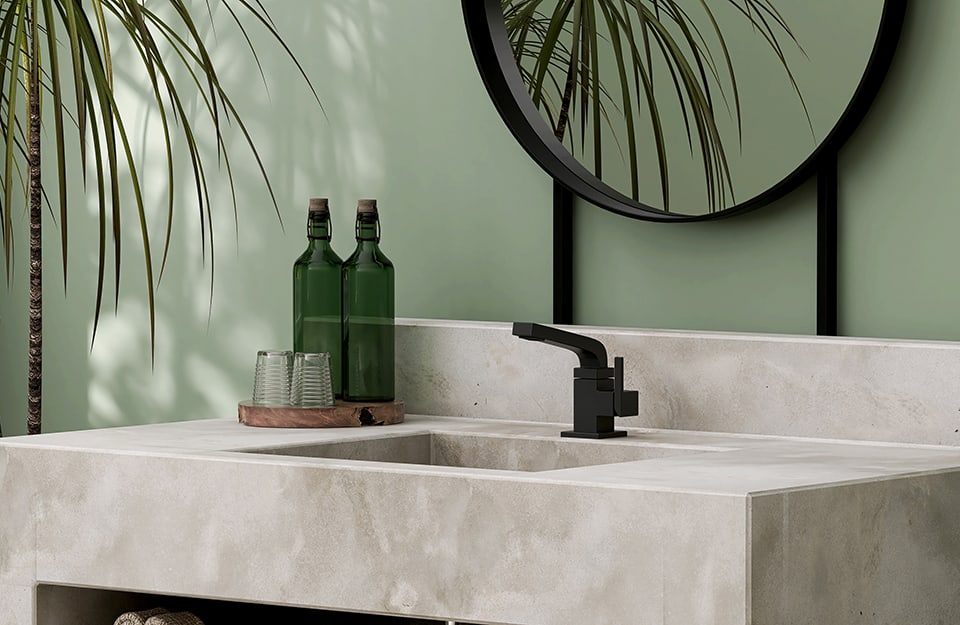 Primo piano di tre quarti a un lavandino squadrato color cemento in un bagno con pareti verde salvia e uno specchio che riflette parzialmente una pianta