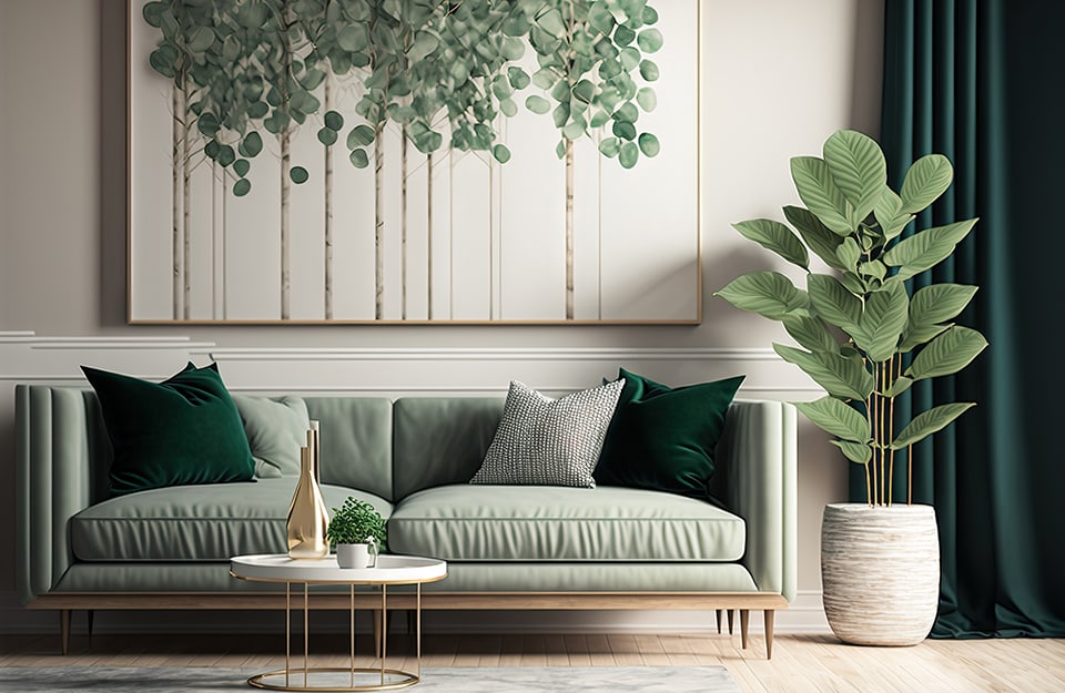 Salotto con divano verde salvia accanto a una pianta in vaso e davanti a un tavolino da caffè con piedistallo in metallo e pianale bianco. La parete è bianca, con un grande quadro a tema naturalistico e si vede sulla destra una grande tenda verde scuro