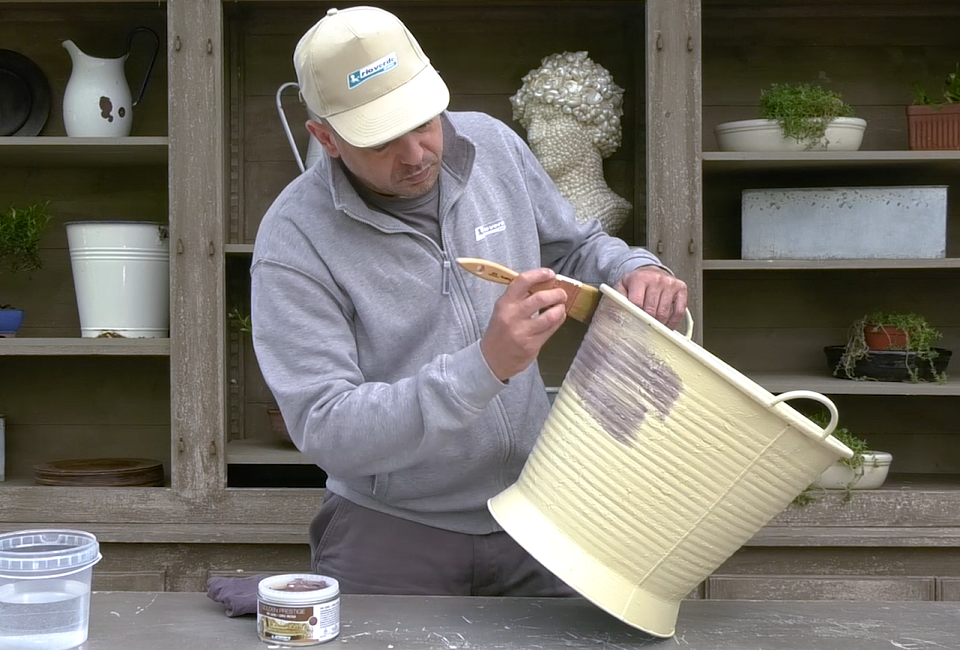 Come primo passaggio, è necessario proteggere con carta gommata le parti desiderate. A questo punto, stendere la vernici all’acqua Vintage Prestige color vaniglia. Stenderla uniformemente, poi, con il pennello, increspare la vernice esponendola al getto d’aria calda del phon. Completata l’operazione, il nostro portavaso va lasciato riposare per 6/8 ore.